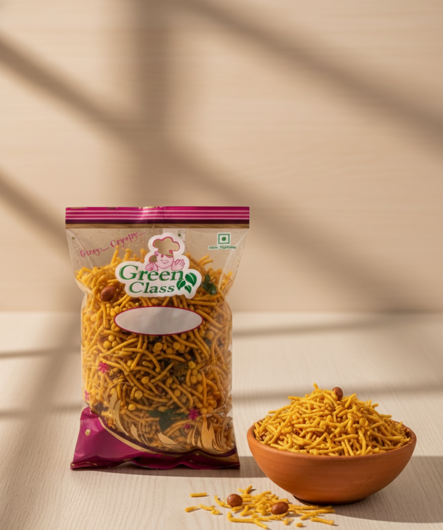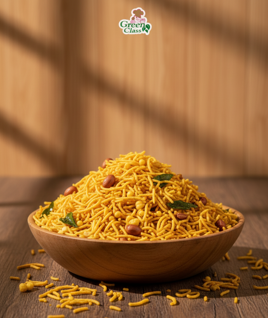 A fiery, flavorful mix of crispy besan sev, roasted legumes, and crunchy peanuts, tossed in traditional Indian spices. Perfect with chai, travel, or late-night cravings — a spicy snack with a clean twist. A flavorful blend of sev, roasted dals, peanuts, and spices.
